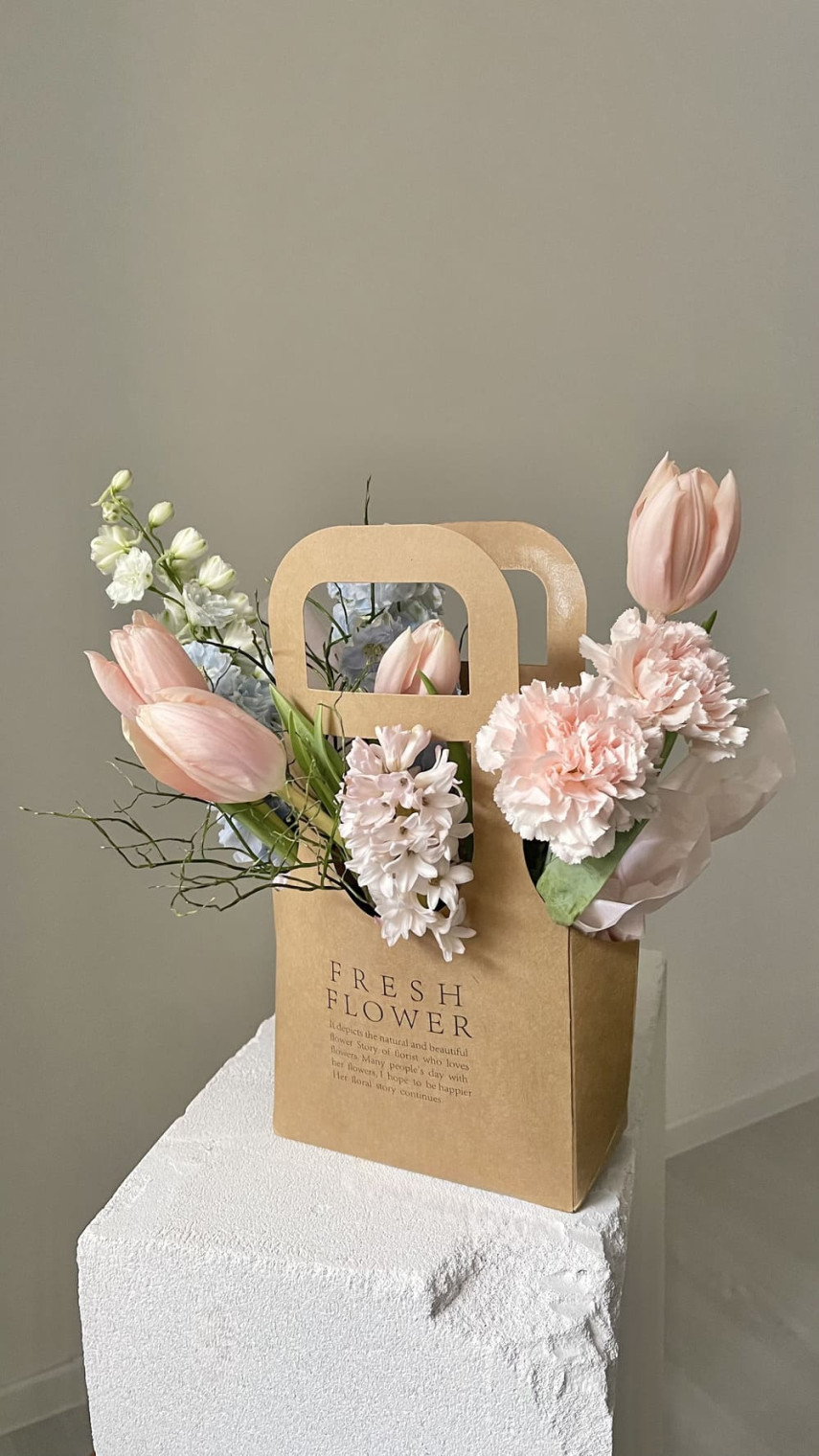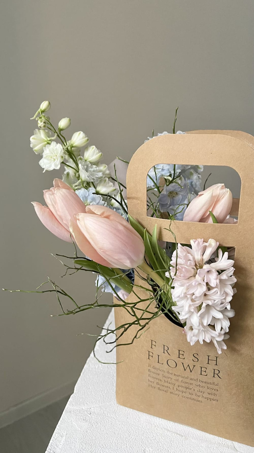 Миниатюрная корзина тюльпанов и дельфиниума Миниатюрная корзина тюльпанов ...